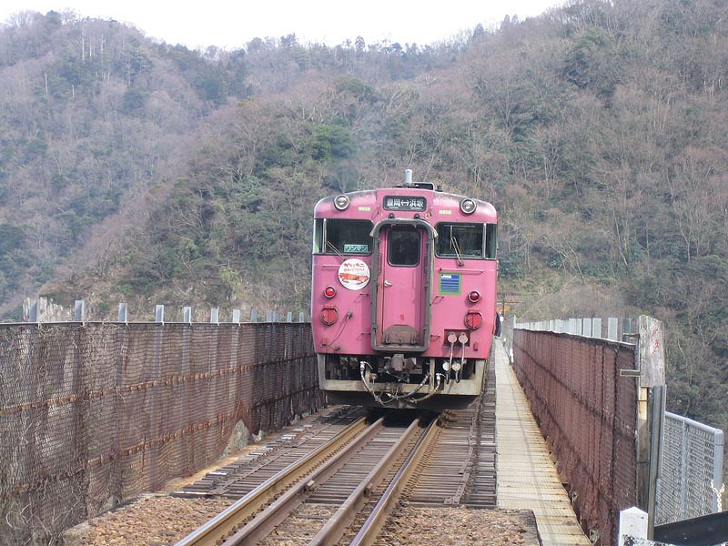 | 餘部駅に停車する列車は、昔から多くはありませんでしたが、餘部鉄橋を渡る優等列車は、国鉄末期から大幅に減ってしまいました。 餘部鉄橋を渡るこのルートは、昔は、京都・大阪から山陰地方へ向かう、メインルートでした。そして餘部鉄橋を渡る優等列車は(全てワタシの記憶による)・・・ 寝台特急「出雲」(東京−浜田),特急「まつかぜ」(大阪−博多。後に大阪−米子に短縮),特急「あさしお」(京都−米子),特急「はまかぜ」(大阪−倉吉(播但線経由)),急行「白兎」(京都−米子?),急行「だいせん」(大阪−出雲市?。夜行もあり),急行「但馬」(大阪−鳥取?(播但線経由)),特急「エーデル鳥取」(大阪−倉吉,JRになってから登場) しかし、その後、大阪,京都から福知山線,山陰本線が電化されてゆき、それによって優等列車は電車特急化され、運転区間が短縮されました。また、山陰方面へは智頭急行というバイパスができたため、メインルートから外れてしまいました。結局、現在は、「はまかぜ」号のみが、大阪,神戸から兵庫県日本海側の都市,観光地を結ぶためだけに運転され、浜坂発着列車を除いて餘部鉄橋を渡っています。 ただし、「はまかぜ」号が通る、播但線も半分が電化されており、全線電化が完成すると、「はまかぜ」号も電化される可能性があり、餘部鉄橋を渡る特急列車が無くなる日が来てしまうかも知れません。ただ、兵庫県日本海側は、温泉地が数多くあり、冬のカニも含めて、観光需要があるため、なんらかの形で、優等列車が残るかも知れません。 |