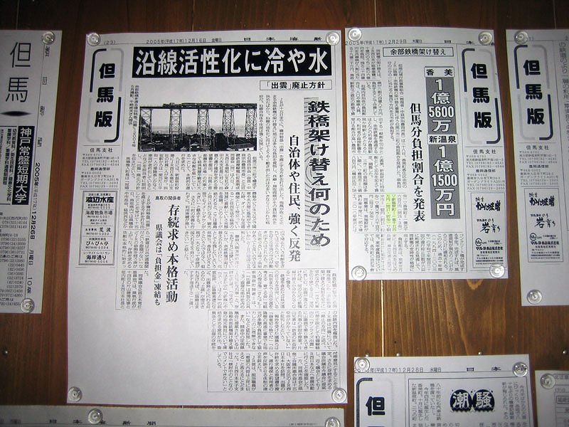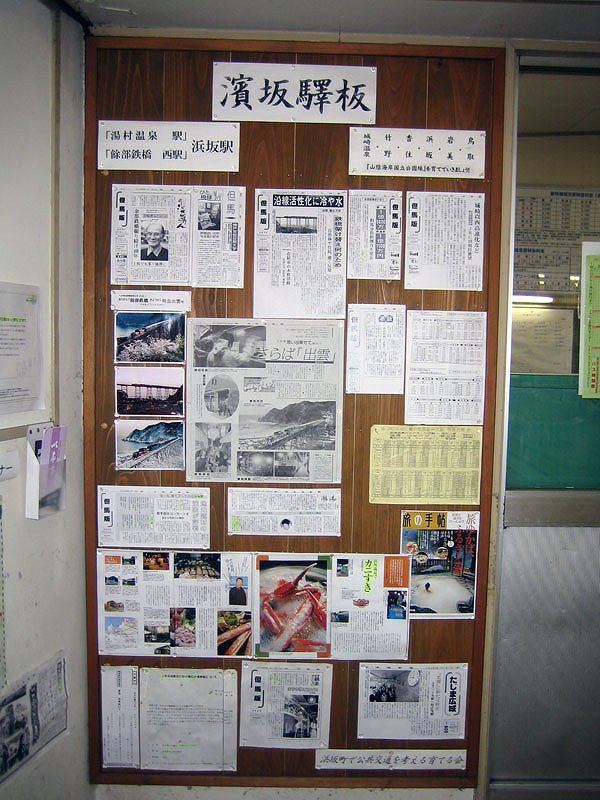 ![]() ![]() 浜坂駅待合室にあった、掲示板?にも餘部鉄橋、そして次のダイヤ改正で廃止となった、客車寝台特急「出雲」号の記事が。 →「出雲」号の写真は、こちらに |