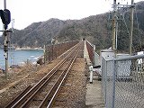 ホーム橋から撮った、餘部鉄橋なお、鉄橋入り口にある信号は、強風時に列車を止めるものです。 |