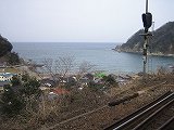 ホームの端から見た、海 |