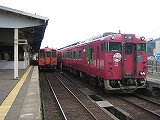 ![]() 浜坂駅に停まっている、豊岡方面への列車(「かにカニ」のヘッドマーク付き)と、鳥取方面への列車普通列車は、この浜坂駅でそれぞれ折り返して行くようです。 |