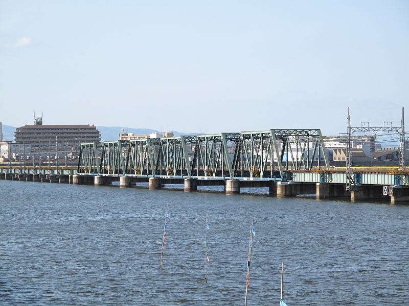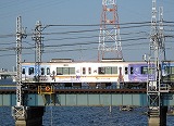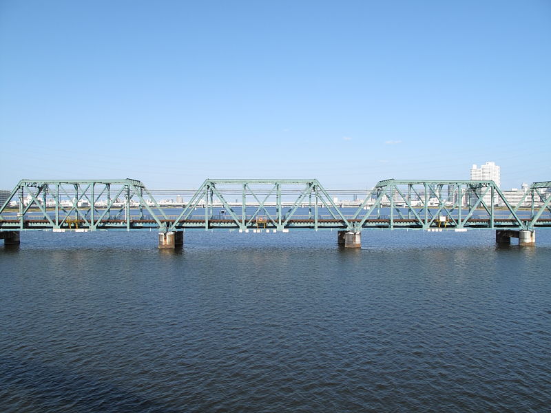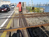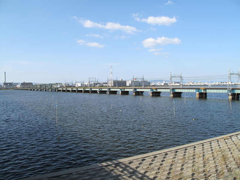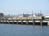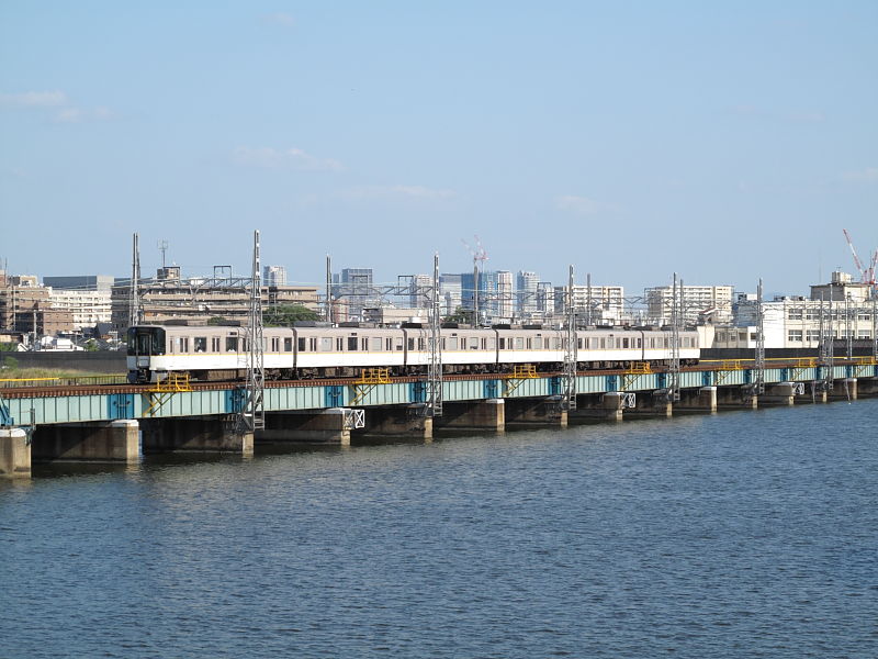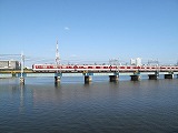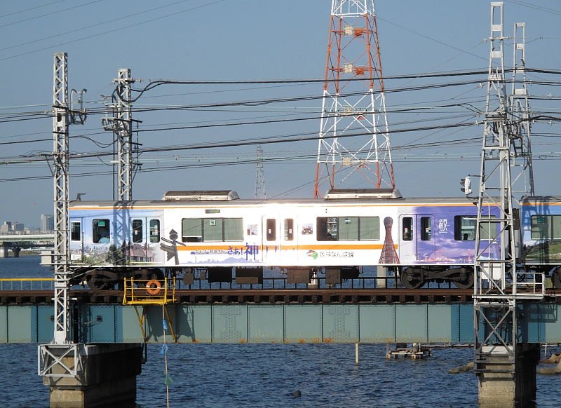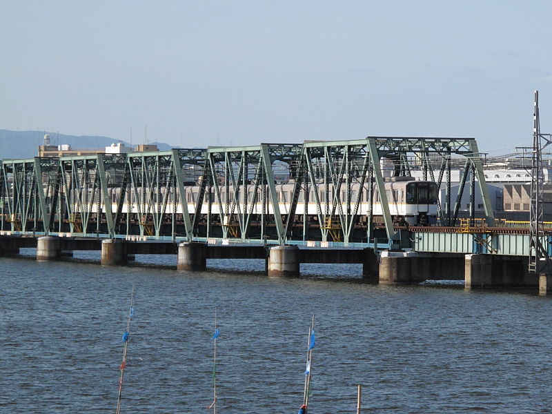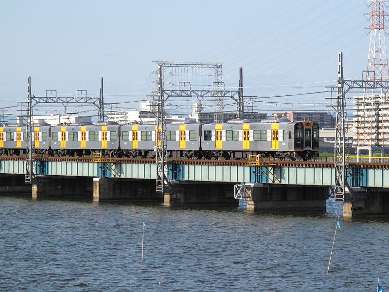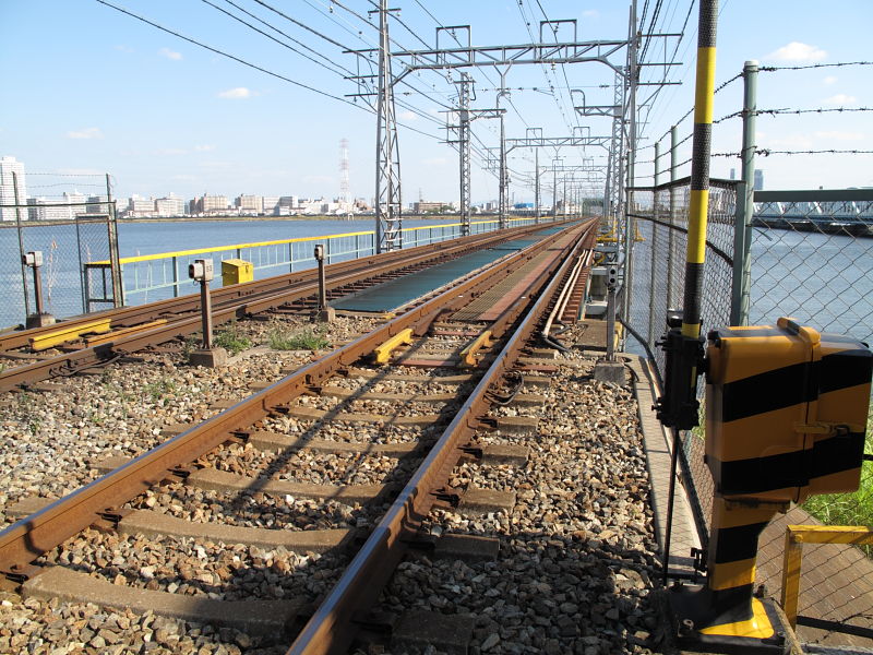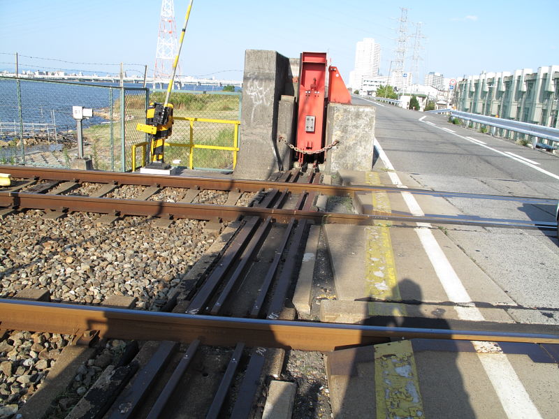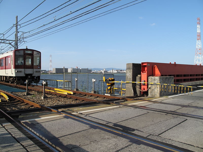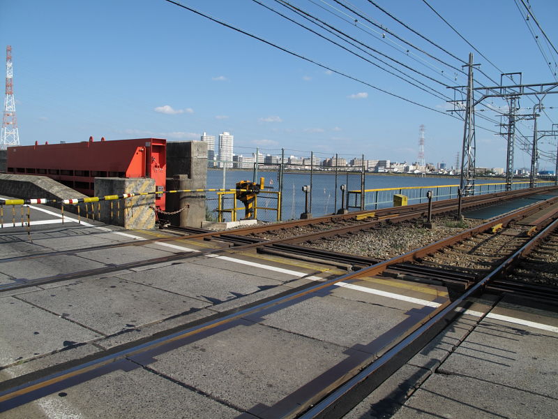 | 阪神なんば線全通(※)により、阪神電鉄と近鉄(奈良線)が、相互乗り入れを開始しました。 その、阪神電車だけでなく近鉄電車も渡るようになった、阪神なんば線新淀川橋梁(通称:伝法鉄橋)と、そこを通る電車。そして、鉄道に存在するものとしては、(おそらく)日本でここだけに存在する「陸閘(りくこう)」(増水時に使用する水防鉄扉)を紹介します。 (※:旧名称「西大阪線」。平成21年3月20日に、西九条駅〜大阪難波駅が延伸開業。同時に「阪神なんば線」と改称した。) |