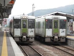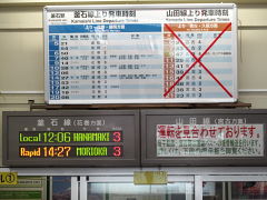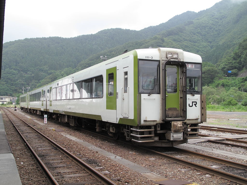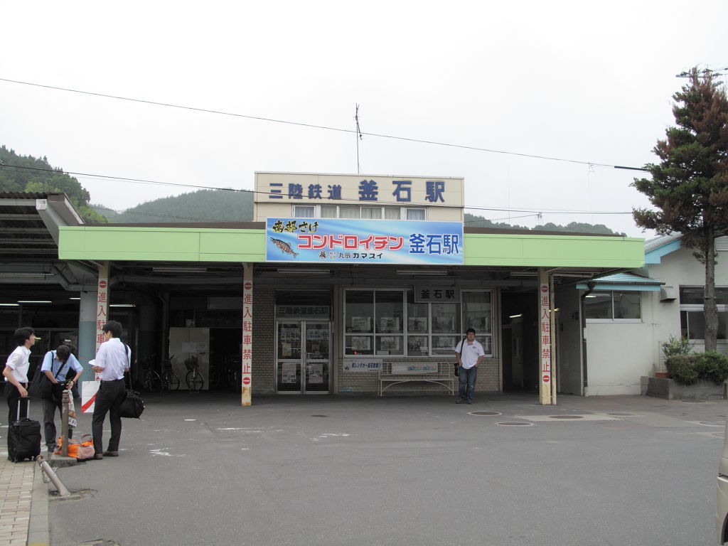 予定より、ホテルを早めに出て、馬喰町駅へ・・・ ・・・予定より20分前に駅に着いたが、電車は1分前に出ていた(-_-;) 結局、予定の列車に乗る羽目に・・・ ・・・前もって時刻を調べていなかった事を悔やむ ・・・これで、自由席に座れないことは確定だな...。 逆に時間が余ったので、みどりの券売機を叩いてみたが、無駄。 ついでに、帰りの「はやて」の空席を見てみたが、やはり空いてない。 東京駅に着く・・・「やまびこ」は、もうホームにいた・・・当然、席はない。 郡山あたりだったか? 自分が立っていた近くの席が、2つ空いた。 3列シートの窓側の席に、「場所取り」的に帽子を投げ込んだ。 自分自身には、「生存競争」と言い聞かせて、やった行為だが 一番直近にいた親子を押しのけ気味に、席を確保したことについて、 ちょっと、後ろめたさが残ってしまった・・・。 新花巻での乗り替え標準時分は7分、それを引くと接続時間の余裕は4分しかない。 なのに、「やまびこ」到着は5分程度の遅れ・・・(×o×) ダーッシュ ε=ε=ε=ε=ε=ε=┌(; ̄◇ ̄)┘ 案内矢印に沿って走ると・・・駅の外へ・・・!?!? 一瞬戸惑うが、走る人の流れもこちらなので信じるとして・・・ 地下道を下り上りすると、いきなりホーム ・・・改札無し! ・・・棒線駅! ![]() ↑新幹線新花巻駅 (ともに釜石線上り列車内から撮影) ↓釜石線新花巻駅(建物下のホーム) ![]() 9:27 快速「はまゆり1号」に乗る・・・運転席かぶりつきに行きたかったが、 先頭車両は指定席なので、後ろかぶりつきに居座る (^O^;)... ・・・10年くらいまで、急行「陸中」だった名残で、指定席がある。 沿線の見所は・・・陸中大橋付近かな? ![]() これ↑は、車窓から撮ったものだが、この先走る線路が、進行方向右下に見える そして↓、陸中大橋を過ぎたら、右上には、さっき通った鉄橋が。 ![]() なお、列車は、黄色いトラスの中を走るのではなく、上を走ります。 ・・・なので、鉄橋を走っていても気付きにくい・・・ ・・・鉄道ジャーナル9月号を見て、気付きました ^o^; 11:04 釜石駅に到着。 ここで、散財タイム・・・「サンフィッシュ釜石」へ向かう。 ![]() 三色どんぶり(^○^) ![]() また、海産物の缶詰や、支援Tシャツを購入。 それから、釜石駅を撮る。 ![]() 本来なら、三陸鉄道南リアス線もこの駅に来ているが、残念ながら運休中で 駅は閉め切り・・・ ![]() ![]() ![]() 駅はとりあえず大丈夫だったので、漁協が仮移転 ![]() 駅周辺の地図・・・駅は海から少し離れてる? ![]() なお、山田線の釜石〜宮古も運休中。 ![]() 列車の改札が開始されたので、駅の中へ。 乗ってきた快速列車(キハ110系)とこれから乗る列車(キハ100系) ![]() ![]() 12:06 釜石駅を後にする。 その後は、新花巻駅で降りれば、新幹線と接続しているのだが、 釜石線完乗を目指すため、花巻駅へ。 ![]() 車両に貼ってったロゴ ![]() 釜石線の駅名とエスペラント名・・・ただし釜石〜浪板海岸は山田線です |