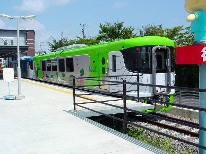 のいち駅に停まっている列車。側面には、各駅のキャラクターが。 |