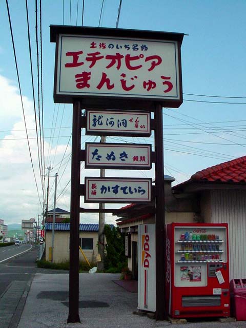 のいち駅から15分くらい歩いた国道55号にある「エチオピアまんじゅう」の店。なんと、エチオピア政府公認です。ネーミングの由来は・・・買えばわかります。(^^) 味は、素朴でおいしい。ただ、保存料を使っていないので、賞味期限は2,3日程度。 |
