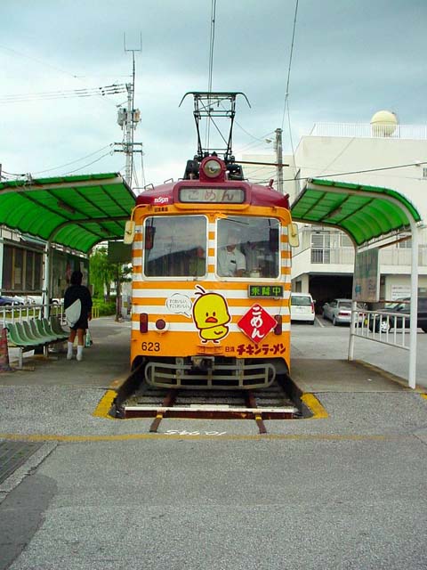 土佐電鉄 後免町駅に到着した電車土佐電鉄の後免町行きには「ごめん」という表示を出し、看板をつけます。 土佐電鉄は、かつて、安芸までの鉄道線を持っていました。 |