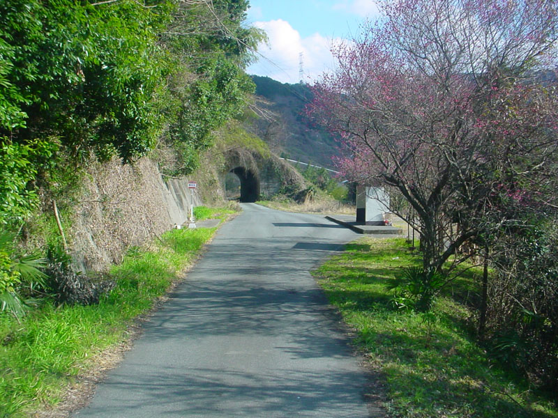 「専用道生子(おぶす)」の少し手前くらいと思われる。手に取れそうな所に梅が咲いている。 |