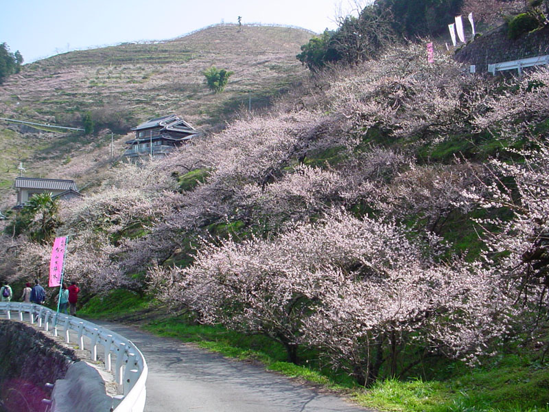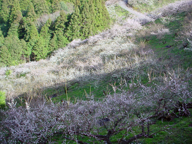| 写真にもあるように、山全体が梅林。ただし、ここは公園とかではなく、「梅畑」(個人の所有地)であるため、ほとんどが周遊道からの鑑賞となる。といっても、写真のように、道の際まで梅がせり出しているので、それでも充分である。 余談であるが、「写真以外のものを取るな」という看板が掛けてある場所があった。 |