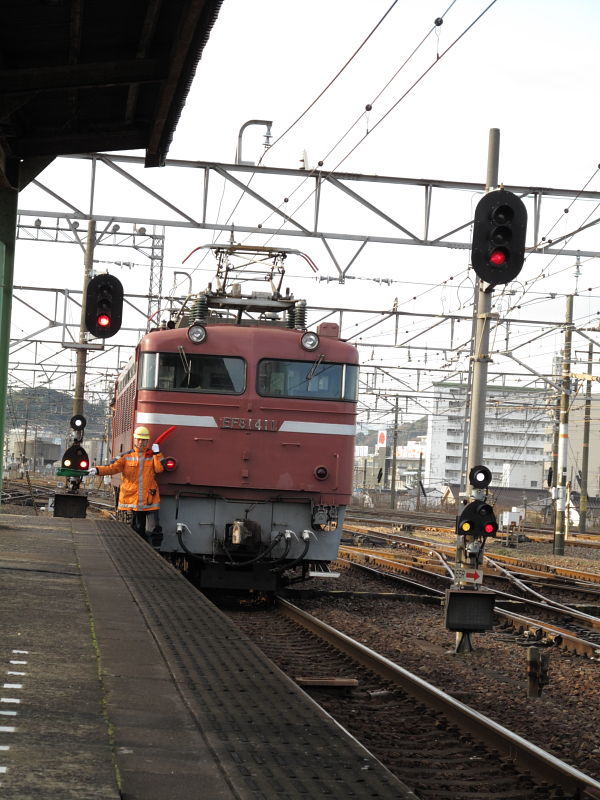 | 関門トンネルは、関門海峡の下を通る、海底トンネルです。 海底トンネルゆえ、昔は、勾配、塩害対策を施した専用機関車「EF10形(関門仕様)」や「EF30形」が使われてきました。 しかし、関門トンネルに特化した機関車では、運用に問題があり、現在は、国鉄交直流機関車の標準形と言える「EF81形」を、関門トンネル通過可能な仕様に変更,改造したものが使用されています。 なお、「EF81形」は、そのまま九州内を走ることも可能で、かつては、一部の寝台特急で、関門トンネルを出たあともそのまま牽引していたものもあったように記憶しておりますが、現在(撮影時点)は、下関−門司のみで、寝台特急を牽引しています。 |