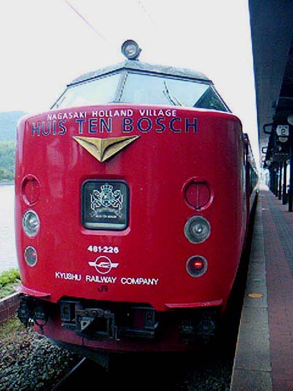 特急ハウステンボス号です。前面は真っ赤。また、この写真では解りませんが、側面は1両毎に色違いの車両で運転されていました。(485系) ※ 平成16年現在、ハウステンボス号はこの車両では運行されていません。現在の車両はこちらかこちらに。 また、この車両は、「きりしま」「ひゅうが」で使用されています。 |