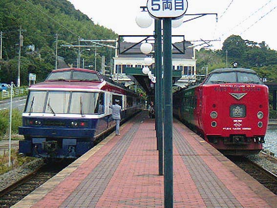 当初、他のJR九州特急と同様の、真っ赤な塗色の列車が使われていましたが(エンブレム等が付いていたので、一応、専用列車でした)、特別仕立ての列車であることをPRするために、側面塗色を緑や黄色に変更されました。そして、平成12年3月改正で、ステンレス車体の783系に置き換えられました。