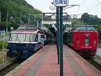 ハウステンボス駅で、シーボルト号とハウステンボス号が並んでいるところです。 |
