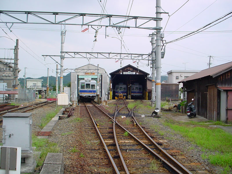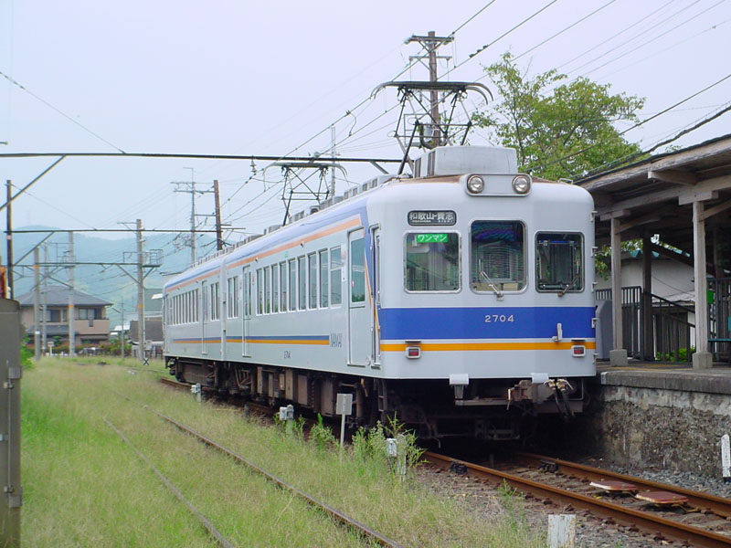 | 貴志川線は、JR和歌山駅から、貴志駅まで、営業キロ14.3kmの路線です。南海電鉄の、他の路線とは接点がありません。 運転頻度は、「貴志」行きが1時間に2本+「伊太祁曽」行きが1時間に0〜2本(休日はあまり運転されない)といったところです(平成17年11月現在)。車両は、もと高野線で使用されていた17m車を、写真のように貴志川線仕様に改造して使用しています(前面貫通扉なし、乗降扉を移設)。 この撮影に行った当時は、廃止が確定していました。平日は、増発されることから、実は、汐見橋線よりも乗客が多いのかも知れません。ただし、他の南海電鉄線との連絡がないため、運用効率が悪かったのではないかと考えられます。また、JR紀勢本線和歌山−和歌山市を乗り入れて、和歌山市駅へ直通して、他の南海電鉄線連絡する、という案もありましたが、貴志川線は架線電圧が600Vで、そのままでは乗り入れが不可能(※1)なため、実現しませんでした。 なお、現在は、岡山電気軌道(両備グループ)が設立した「和歌山電鐵」によって、存続が決まっています。 |