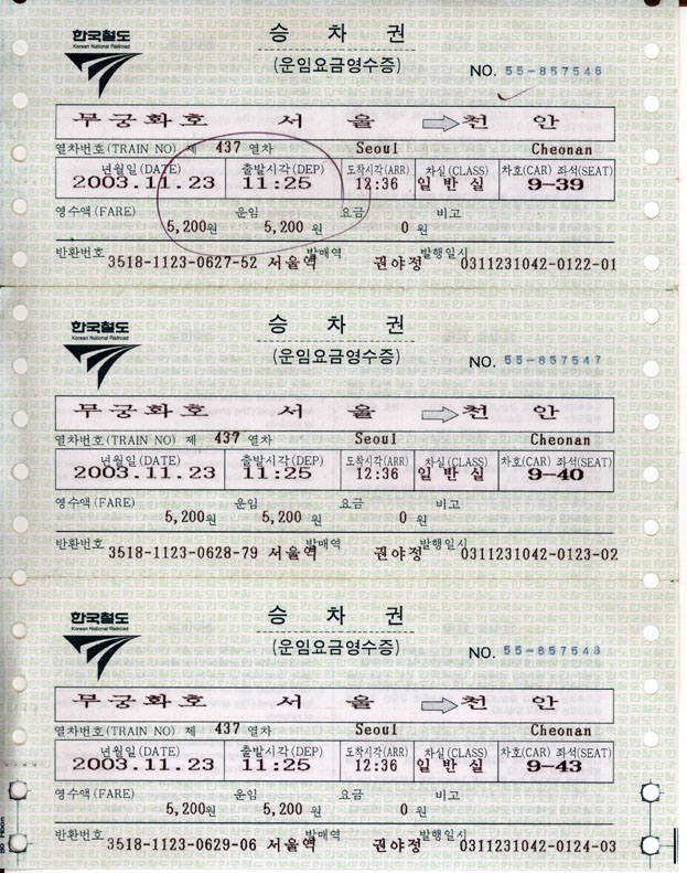 ムグンファ列車には 4人で乗りました。で、そのうちの1人が、きっぷが欲しいといったので、3枚が手元に残りました。 ハングルが読めなかったら、これがセマウル列車のきっぷか、ムグンファ列車のきっぷか、ワカラナイ(^_^;) (ちなみに、韓国鉄道のマーク下に「ムグンファ」と書いてあるようだ。) 座席番号は、JRの特急のようなABCDを使わず、単に番号を振っているようだ。(近鉄特急なんかと同じ形式) ところで、この切符の紙にびっしり書いてあるハングル文字は、いったいなんて書いてあるのでしょうか? |