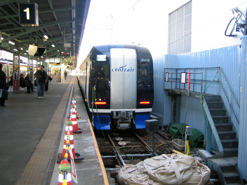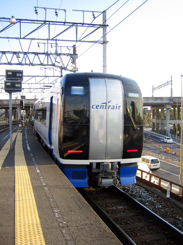 ![]() 「ミュースカイ」と呼ばれる、中部国際空港行き快速特急です。(全車指定)この車両は、車体傾斜制御装置を備えていて、曲線を高速で走ることができます。 “centrair”(セントレア)とは中部国際空港のことで、「中部地方」“center”と「空港」“air”の造語です。 |
