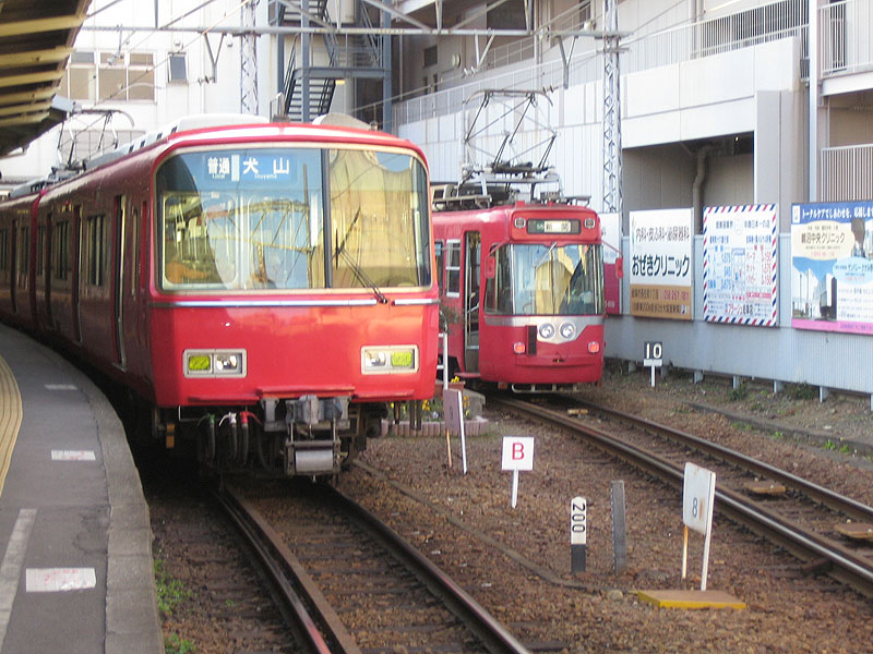 各務原線列車の影から顔を出す、美濃町線電車。 |