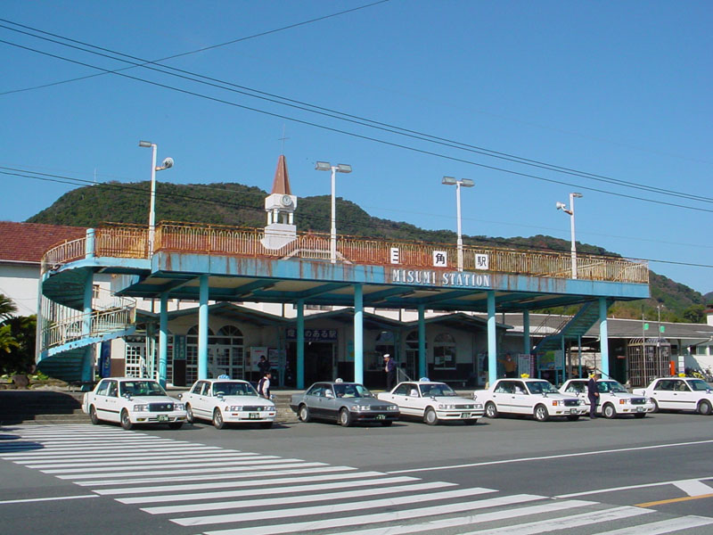 三角線の終点、三角駅。宇土駅から25.6km(営業キロ)のところにあります。三角駅は宇土半島の先端にあり、天草諸島の玄関口となっています。ローカル線の終点としては、たくさんのタクシーが客待ちをしていました。 |