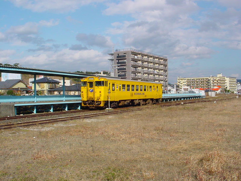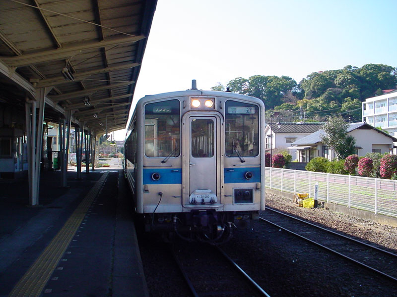 日南線は、日豊本線の宮崎駅の次、南宮崎駅から分岐し、「鬼の洗濯板」で有名な青島、それから海沿いと海から少し離れた山間を繰り返し、大隅半島の付け根にある志布志へ向かう線です。ほとんど宮崎県内を走りますが、終点の1つ手前の大隅夏井駅からは鹿児島県に入ります。ほとんどの列車が宮崎駅発着となっています。また、昼間に快速「日南マリーン」号が1往復あり、普通列車は、ほぼ1時間に1本ですが、半分近くが青島止まりとなっています(平成17年8月現在、宮崎空港行きを除く)。