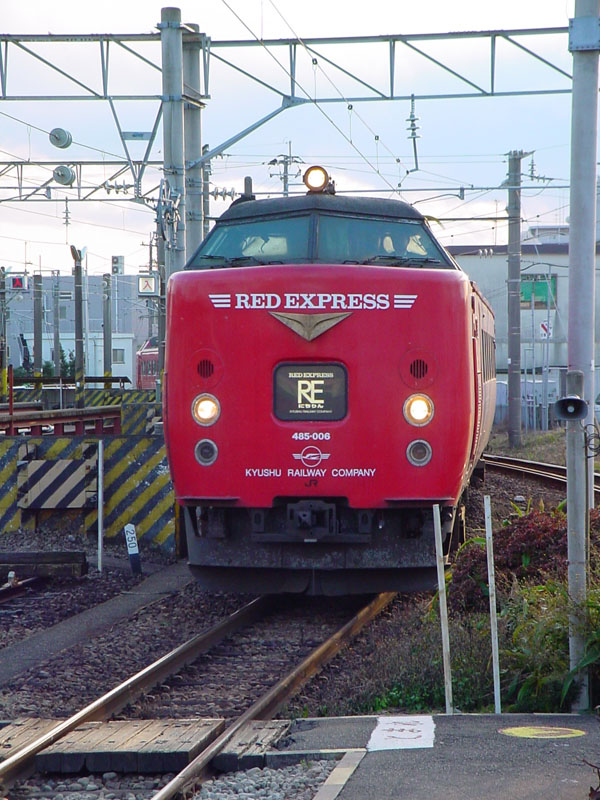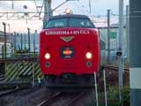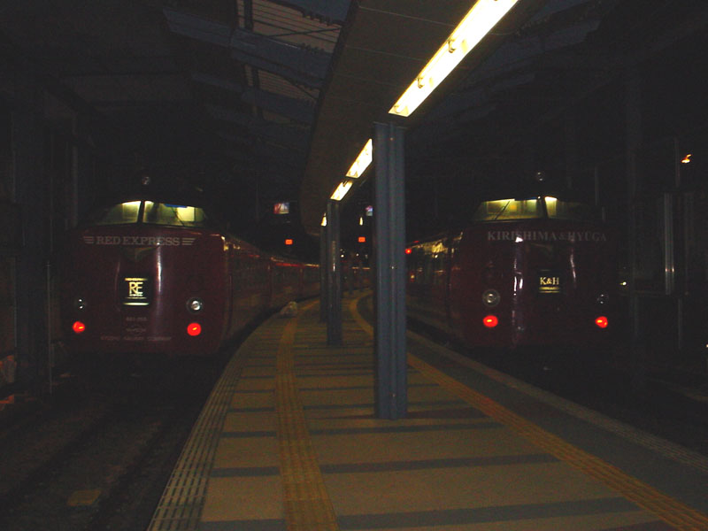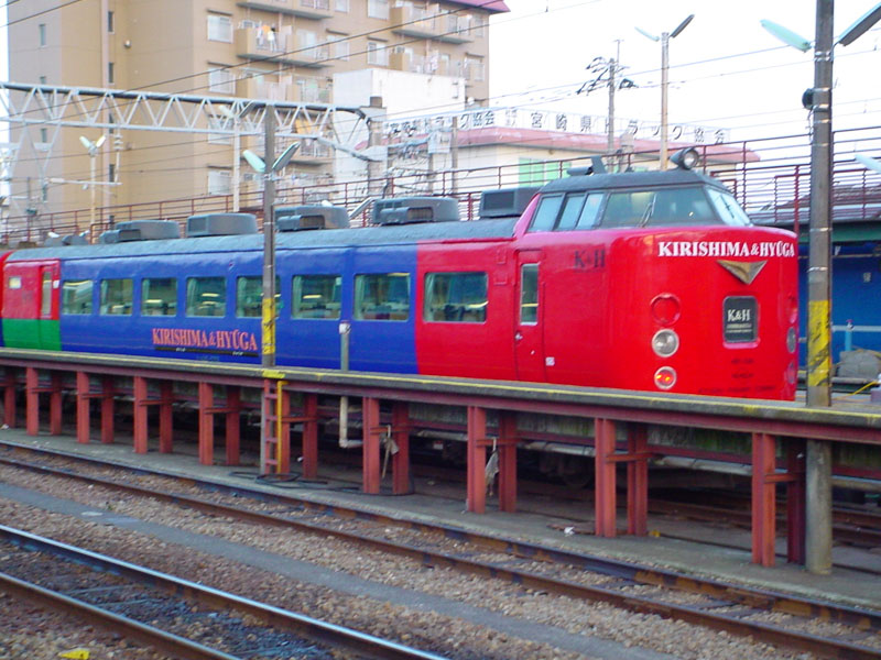 南宮崎駅構内の留置線に泊まっている、「きりしま」,「ひゅうが」用485系車両この塗装は、もと「ハウステンボス」号の塗色です。塗色変更せずに、そのまま使用されています。 |