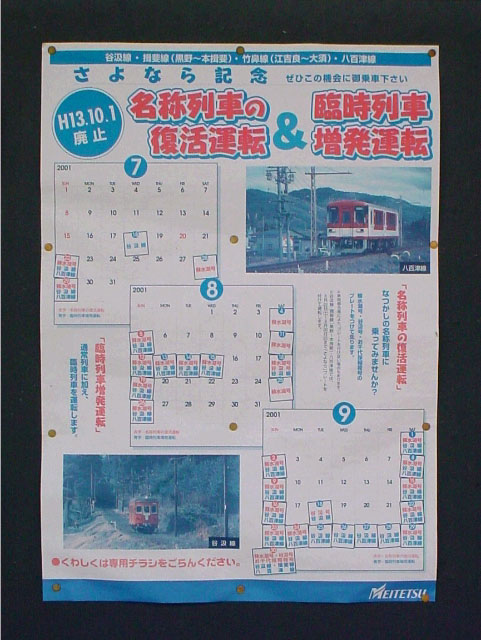 名古屋鉄道 竹鼻線大須駅,八百津線八百津駅 (平成13年8月16日撮影) 平成13年9月30日限りで廃止された、名古屋鉄道の竹鼻線(江吉良〜大須),八百津線,揖斐線(黒野〜本揖斐),谷汲線。 廃止される前に、乗りに行ってきました。