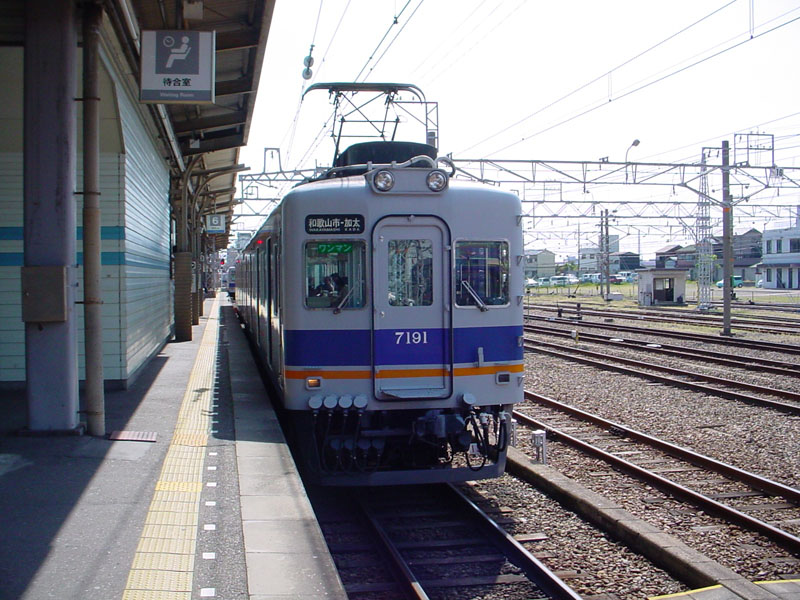 | 加太線は、南海線紀ノ川駅から分岐し、加太駅まで、営業キロ9.6kmの路線です。なお、列車はすべて、和歌山市−加太の運転となっています。沿線には、住友金属和歌山工場などがあります。運転間隔は、終日、ほぼ20分に1本の間隔で運転されています(平成17年11月現在)。また、写真で見る限り、20m大型車が使用されており、和歌山市駅での南海線列車が1時間に5本(普通列車は2本)であることを考えて、そこそこに乗客があるのかも知れません。(途中駅の旅客がほとんど見込めない和歌山港線も、加太線と同じ車両が使用されていますが、おそらく共通運用になっているものと思われます→和歌山港線はこちら) |