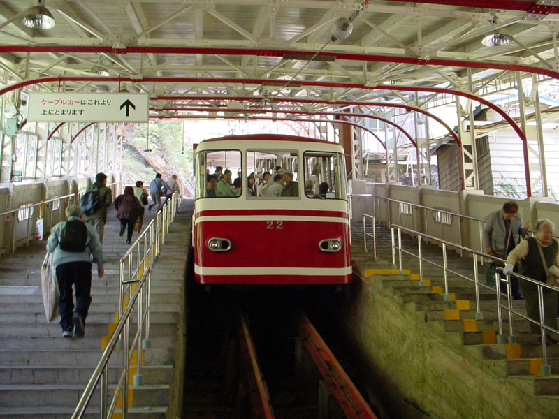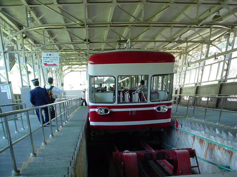 高野山駅に停まっているケーブルカー・・・ちょっとこわい傾斜。 |