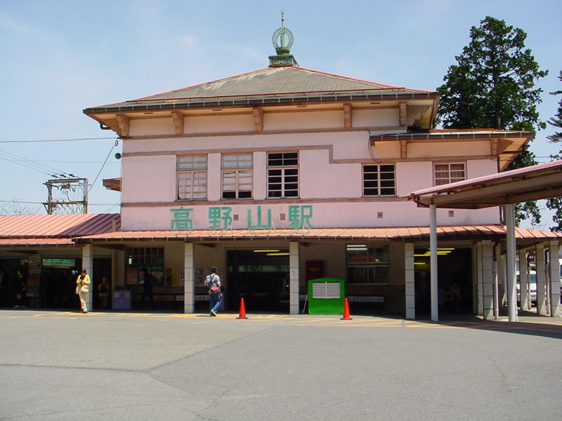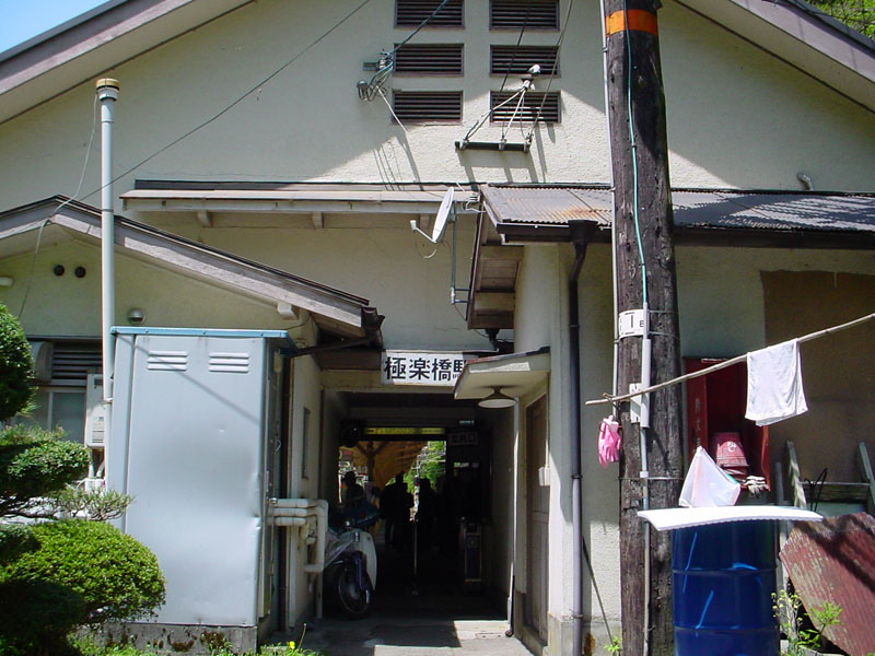 極楽橋駅。残念ながら、良いアングルでは撮れなかった。 右側の坂を上がったところが、入り口(改札)。 改札を入ってまっすぐが、難波方面行きのりば。左へ行くとケーブルのりば。 |