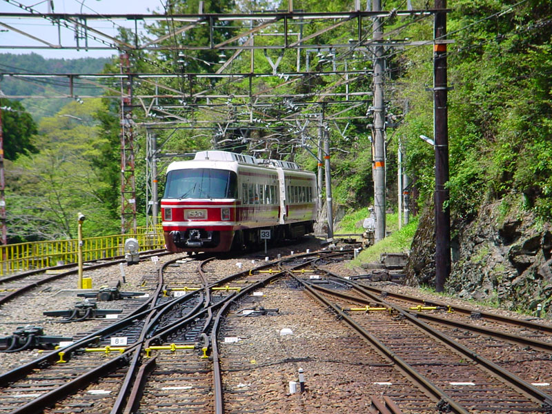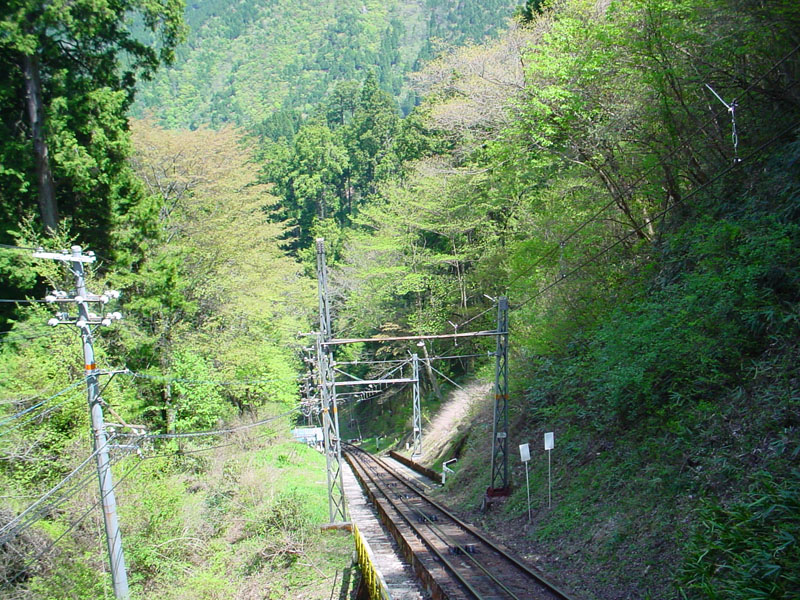 | 高野山ケーブルは、高野線の終点極楽橋駅から、高野山を登っていくケーブルです。最急勾配は563パーミル(約30度)に達し、かなり急な部類に入ると思います。 高野線にとって、極楽橋駅は終点なのですが、下車しても何もなく、ケーブル乗り換えのためだけの中間駅といった感じです。 高野線自身も、幹線と呼べるのは、(難波〜)岸里玉出〜橋本の区間だけで、橋本以南は、20m級の大型車が入線できず、さらに高野下から先は1時間に1〜2本(平成17年11月現在)となり、山岳地帯のローカル線といった感じです。 |