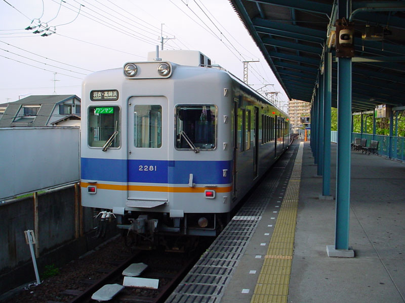 運転間隔は、昼間20分,ラッシュ時15分となっています(平成17年11月現在)。また、車両は17m中型車。 街中を走っていながら、この運転形態は、あまり存在価値が無いのかも知れません。羽衣駅に於いても、高師浜線ホームは改札口から遠い側に、切り欠きホームとして存在するため、影の薄い存在となっている感じがします。しかも、羽衣駅は、JR阪和線(羽衣支線)東羽衣駅が目の前にあり、乗り換えといえば、むしろそちらの方が目立っている感じがするのは、ワタシだけでしょうか? |