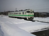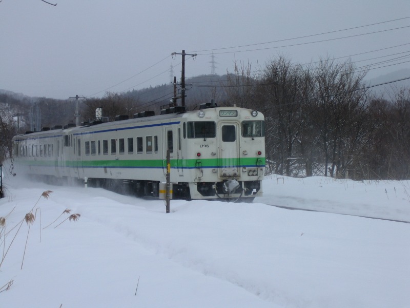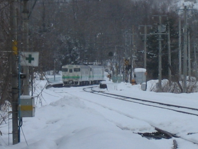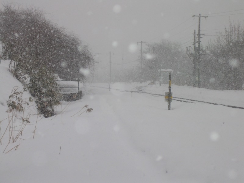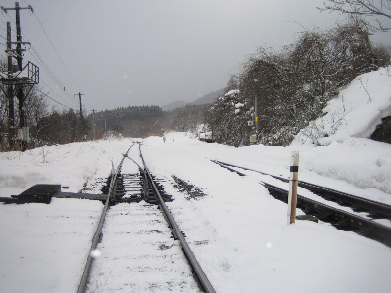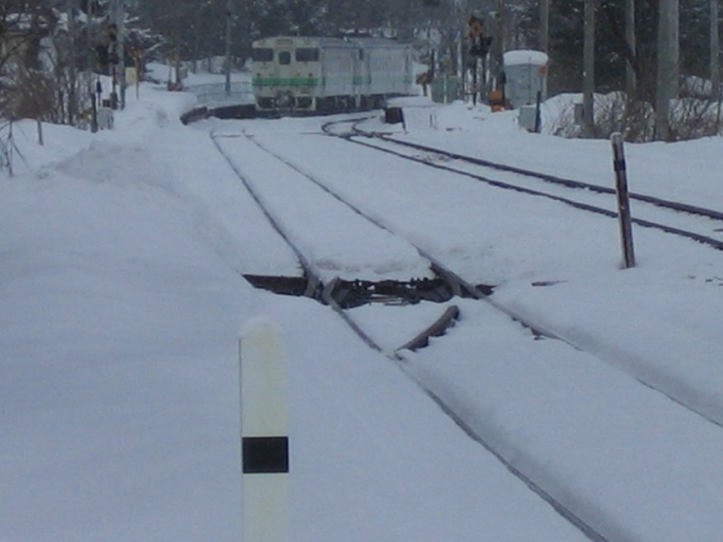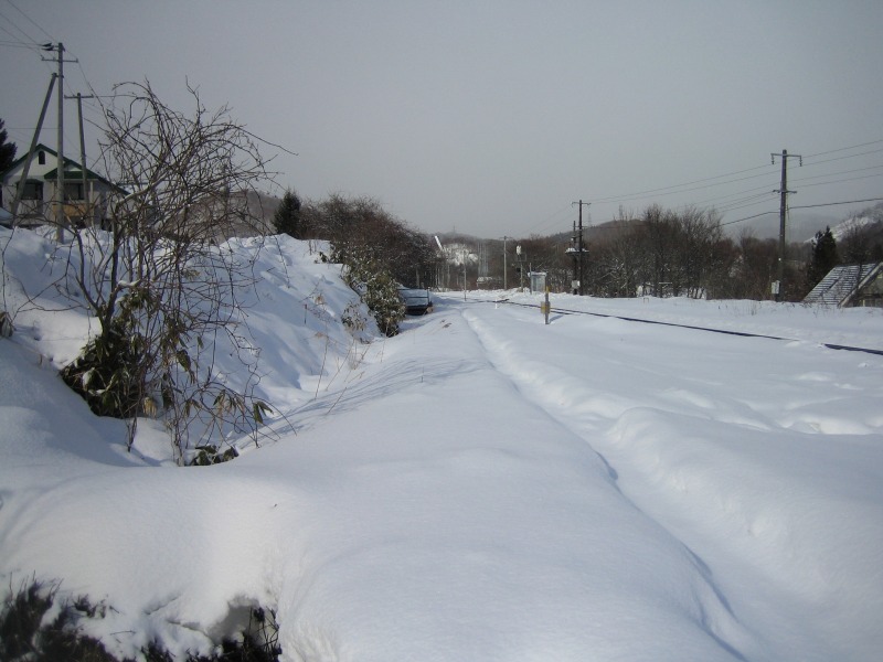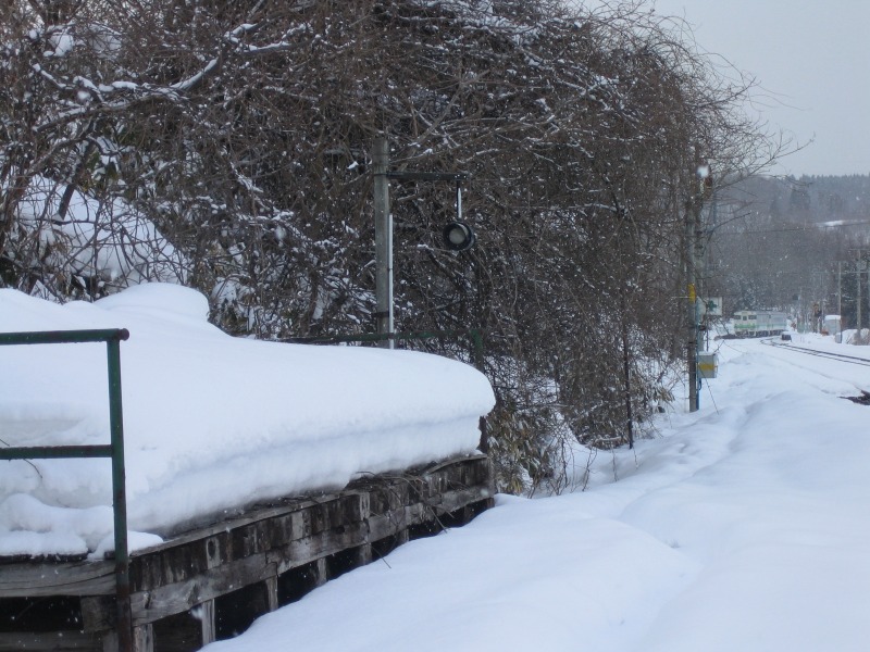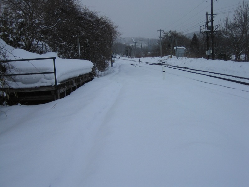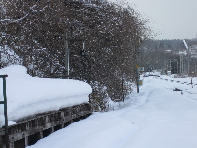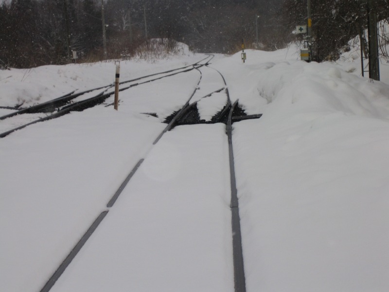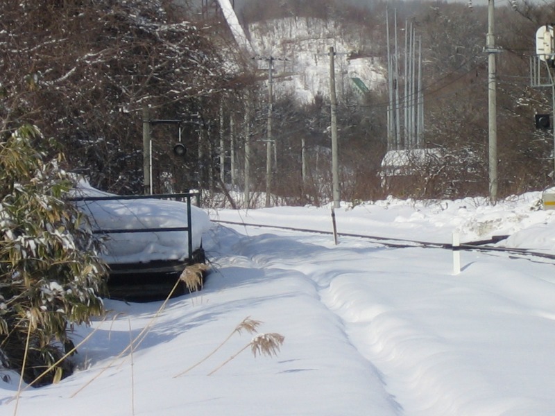 「戦時型スイッチバック」というのは、第2次世界大戦中に、勾配区間の輸送力(特に貨物)を増強するために作られたスイッチバックです。通常のスイッチバックは突っ込み線と加速線を有し、本線とエックス型になっているのに対し、登坂のための加速線だけが枝のように出ています。 戦時型スイッチバックは、戦争が終わるとともに不要となったところもありますが、仁山信号場(当時)は、行き違い型信号場でかつ客扱いを行っていたため、急勾配途中でありながら列車を停車させる必要があり、大沼方面に向かう列車を発車させる際、坂道発進となるため、戦争終了後も加速線が活用されていたようです。しかし、その後、勾配緩和線である通称「藤城線」が開通したことで、下り(大沼方面)優等列車,貨物列車、そして一部の普通列車はそちらを経由することになり、加速線の活用が激減しました。それでも客車普通列車が停車した際には、使用があったようです。(I love Switch Backに、昭和50年代に客車列車が加速線に入っている写真が掲載されています。また、同ホームページによると、仁山信号場は、開設当初は一般型スイッチバックであったそうです。) この駅の訪問を、敢えて真冬に行ったのか・・・? ・ 雪の積もった状況から、スイッチバックの使用状況が確認できる ・ 降雪時、スリップ対策で加速線を使用するのでは。という甘い期待。 結局は、写真で見るとおり、線路は雪に埋もれており、使用されている形跡はありませんでした。しかし、放置状態であると考えると、積もっている雪の量が少ないように思います。 まさか、除雪車が入ってたりとか・・・。 |