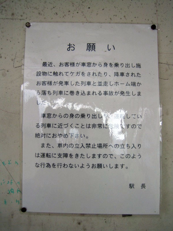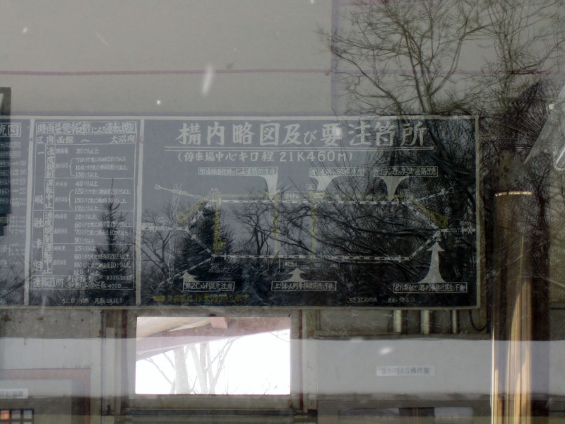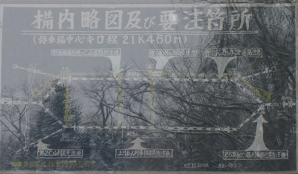 ![]() 駅建物内にあった、構内略図。「加速線退行時の仁山踏切注意」の文字が・・・。 窓の外から撮ったため、非常に見づらいですが・・・。 このほかにも、信号に関する設備があったような気がします。 信号場であった過去から考えて、この付近の信号に関する設備が有るのは、当然と思われます。 |