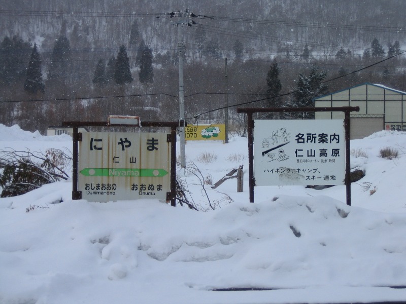 | ※1 車両接触限界標識(積雪地用) : 2つの線路が合流する場所の手前に設置される標識。車両が、合流点に向かっている際、標識より手前であれば、合流する相手の線路の走行を妨げない。通常のものは、白い四角い標識が地面から顔を出している程度であるが、積雪地用は、雪に埋もれてしまわないように標柱の形を取る。 ※2 レピータ : ホーム等に設置される出発反応標識。列車出発に関する信号機(通常は場内信号機)が青になったら点灯する。本来は、(列車最後尾にいる)車掌に、出発信号の現示を知らせるもの。仁山スイッチバックのものは、加速線からは見えない出発信号の状況を表示する、中継信号機のような使われ方をしていると思われます。 |