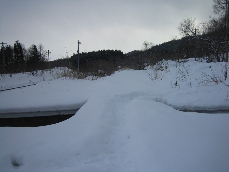 川をまたぐ路盤。奥が本線で、雪に埋もれつつも、手前にも路盤があることが確認できます。 |