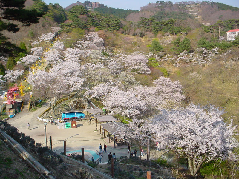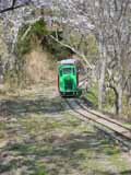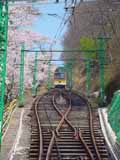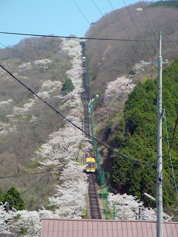 ![]() ![]() ![]() ふもとの黒川駅前から撮影。桜並木の横を上り下りするケーブルカー |