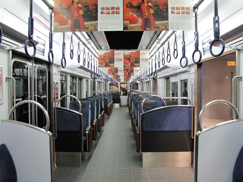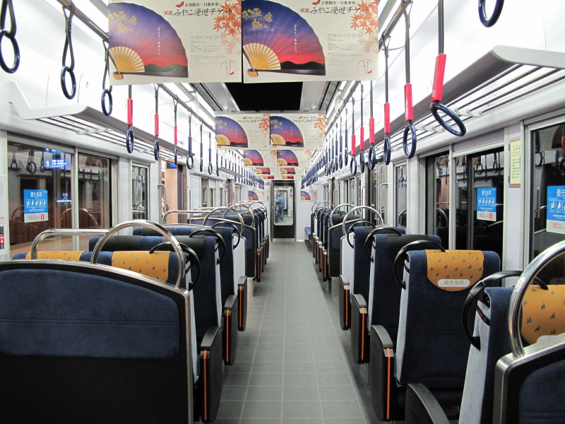 ![]() 中之島駅に停車中の、「コンフォート・サルーン」3000系車内2+1列の、転換クロスシートが並んでいます。なお、車端部はロングシートがあります。 |