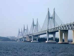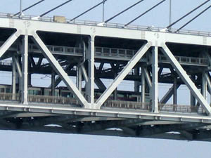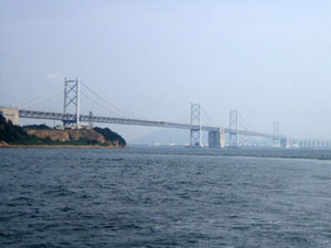 下から見た瀬戸大橋 下津井瀬戸大橋(左上), 櫃石島橋と岩黒島橋(右上), 北備讃瀬戸大橋と南備讃瀬戸大橋(左下), 櫃石橋を渡る列車(右下) (平成17年8月14日撮影) 平成17年8月16日〜9月13日掲載 |